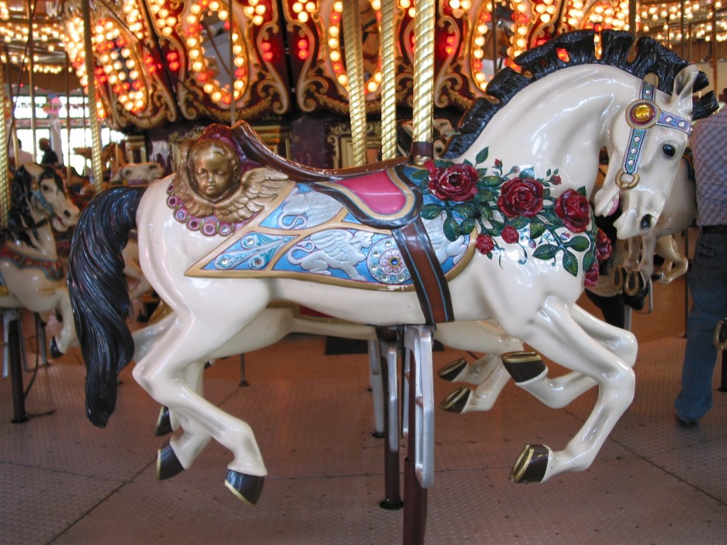 But, looking back, I always gravitated to calmer, more placid rides such as the merry go round or carousel and ferris wheel. These rides do not thrill, they entertain in a predictable sort of way. The brightly painted animals of a carousel make one choose which one to mount. Round and round you go, looking for your loved one or those passing by as you ride. The ferris wheel is somewhat scarier in that your car might swing in mid-air when they load and unload, keeping you at the top for longer than you wish.