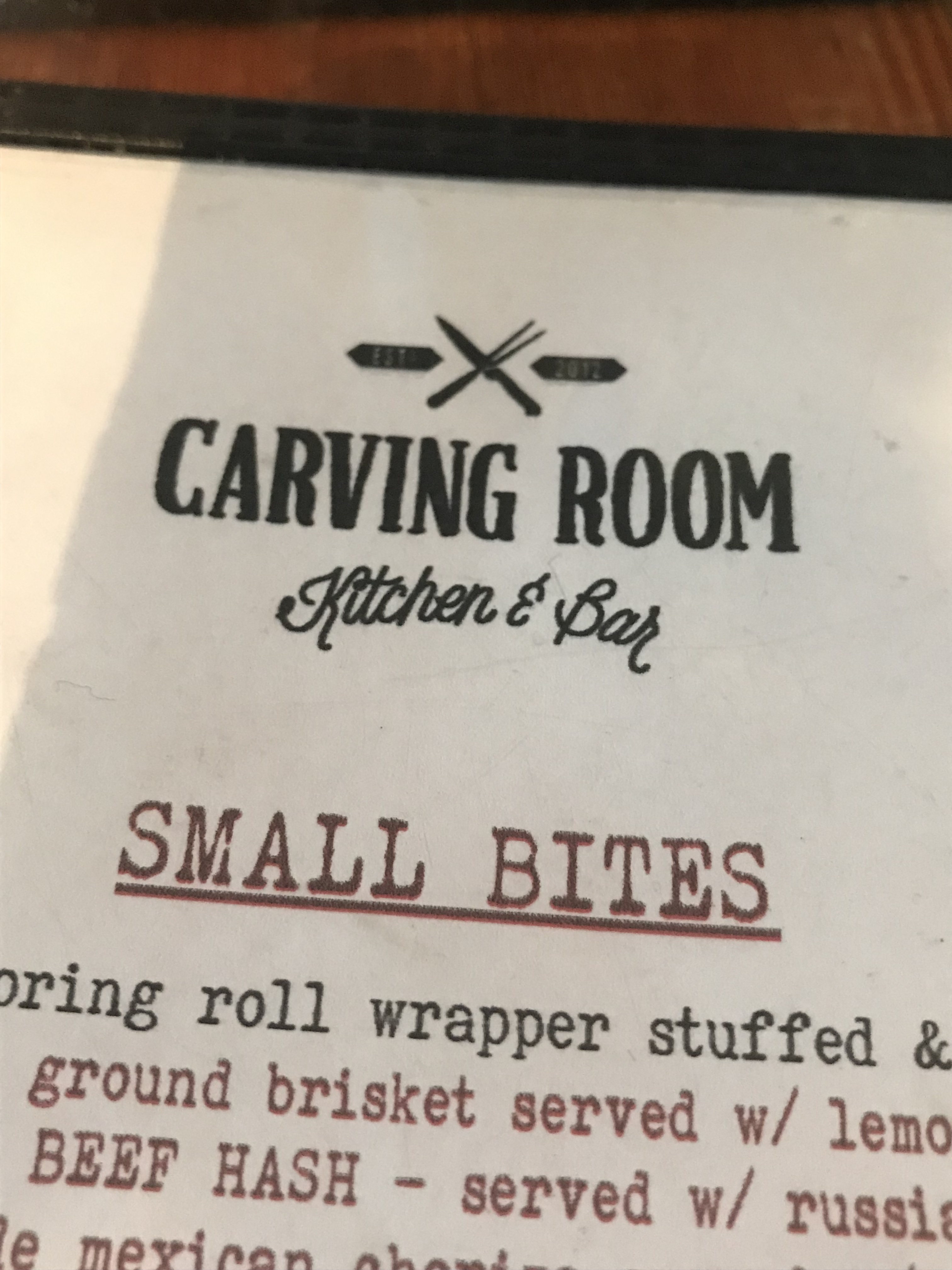 Upon entering, we noticed that The Carving Room was small. There were more tables outside than inside. The bar also had plenty of seating. The hostess seemed very busy and was seating a party of four who had entered just before us. They had two small children. We had three adults. The bartender waved my husband in but we weren’t sure he intended us. When the bar tender noticed that we didn’t respond, he made his way over to us.