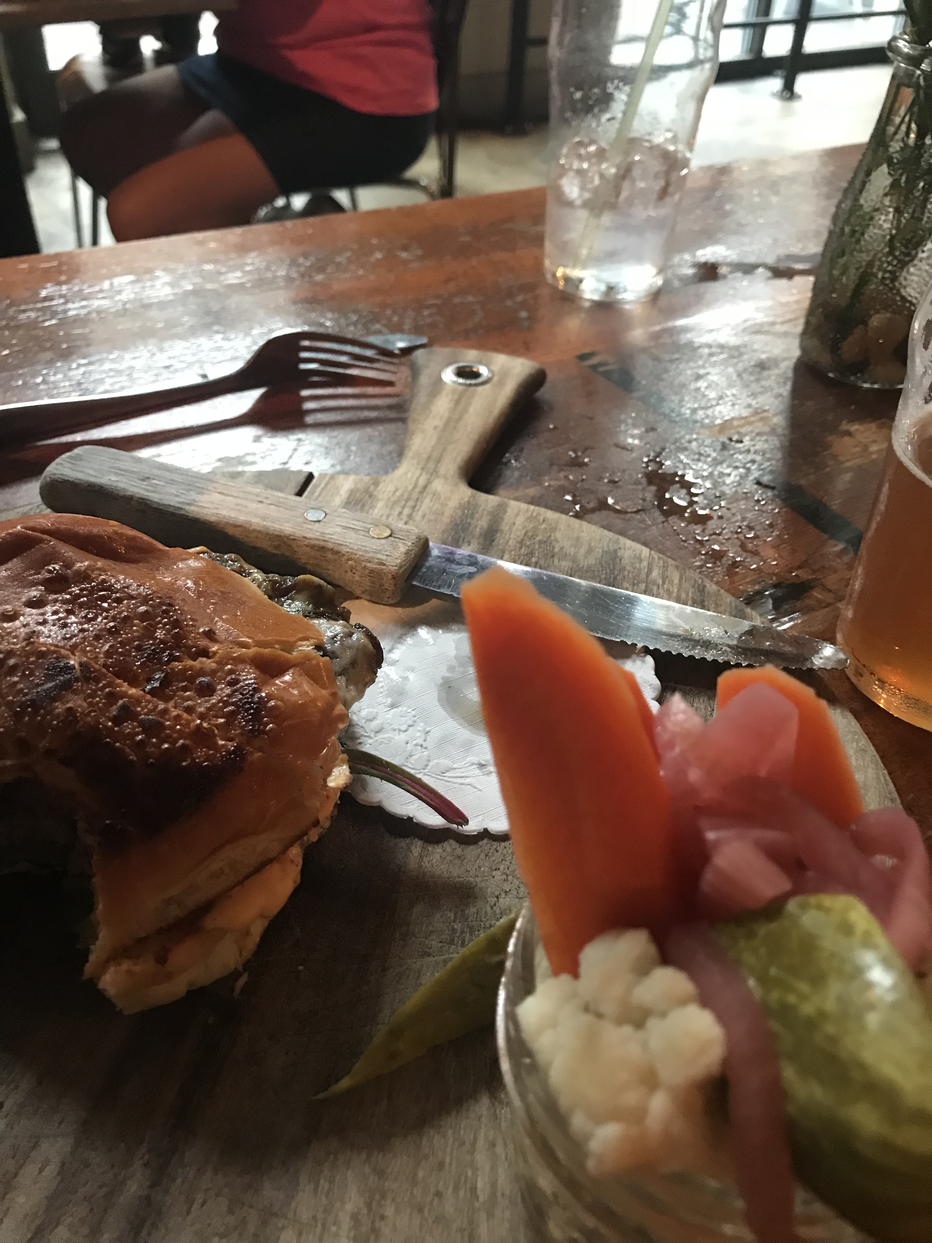 My husband had the Carving Board Burger, which, he said was the best burger he’s ever had! His side was a small pickle bar – which you can see in this photo was a half pint jar filled with pickled vegetables! Yum! I ate most of that on him!