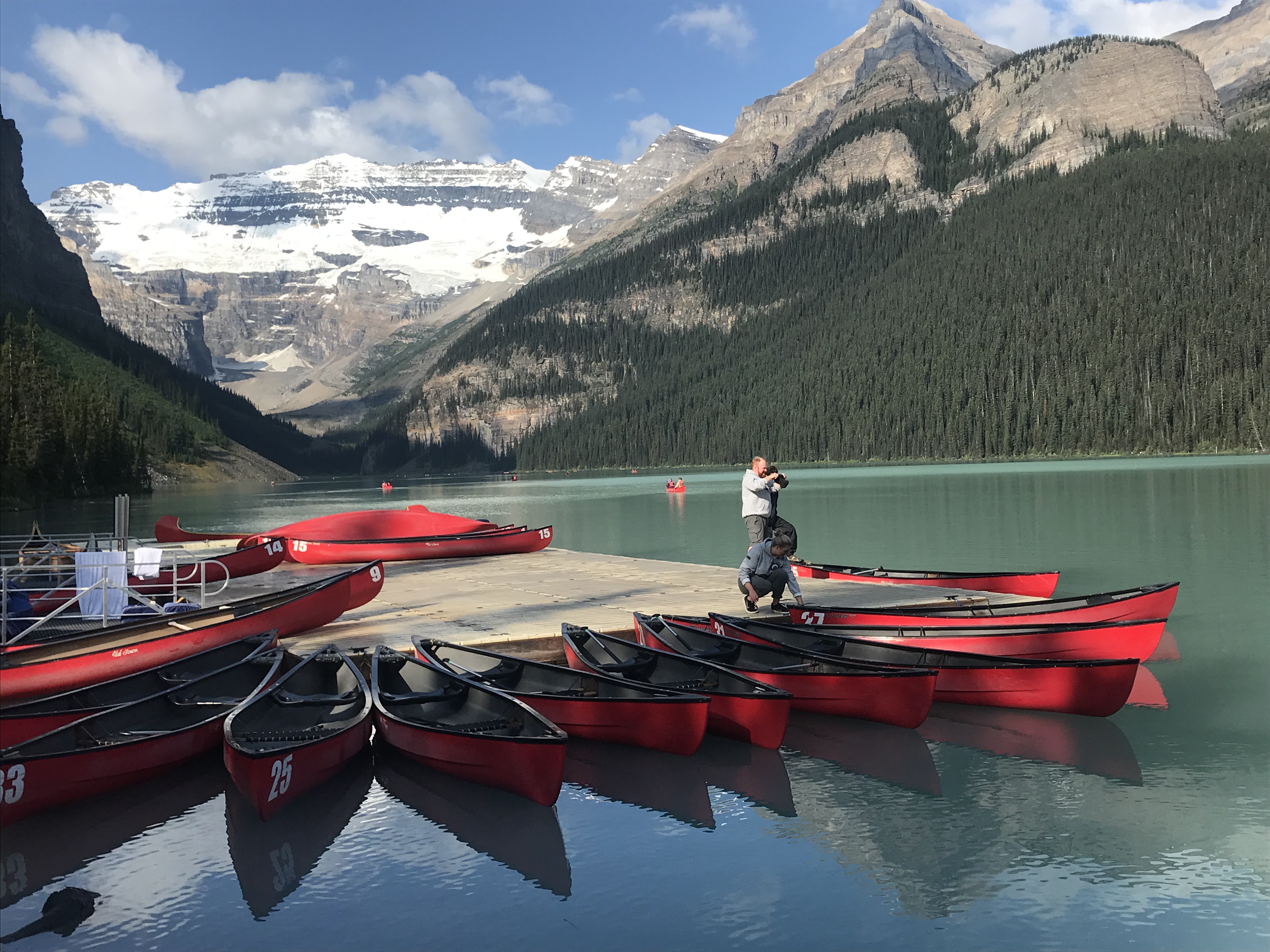By 7:45 a.m. we were lined up for the shuttle with turned out to be a fleet of school buses! We arrived at Lake Louise with the sun starting to peak through. The glistening blue water was mesmerizing! Photos were immediately in order, not only for use but for hundreds of other visitors. Finally, we weaseled our way to the shoreline to grab a few less than memorable shots due to the crowd. My husband quickly ventured over to the canoe rental building and soon our morning was planned! We’d be spending some time paddling Lake Louise!
