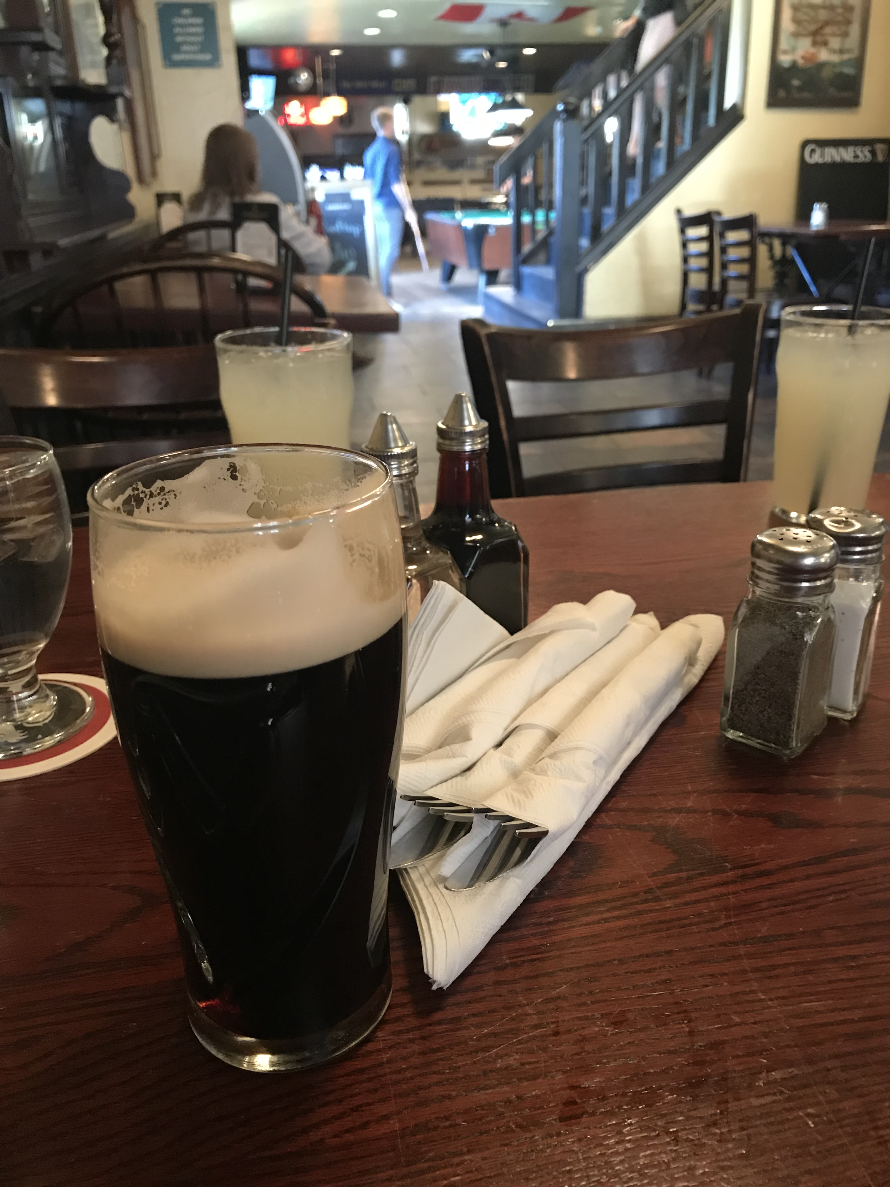 We settled for a table inside, of which we had our pick! Soon, a chirpy waitress gave us menus to peruse! Wow! So many choices! Lots of English pub food and some American staples as well. I chose a Guinness Beer and chicken Caesar salad. The Guinness was my first – a recommendation from my oldest son and I was not disappointed. One of my more cautious eaters had a Bison burger and Sheppard’s Pie was on tap for my husband.