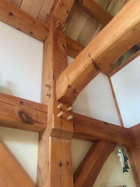 Our cabin is a timber frame. If you are unfamiliar with this type of building, it is also known as post and beam. There are huge wooden (pine) beams that form the structure of the building. Wooden pegs hold the beams together. They were pounded into place by an oversized mallet called the “persuader.”
