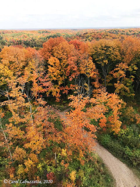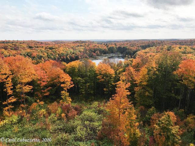 View from the Timm’s Hill Lookout across the lake is the Hill of Beans Restaurant. © Carol Labuzzetta, 2020