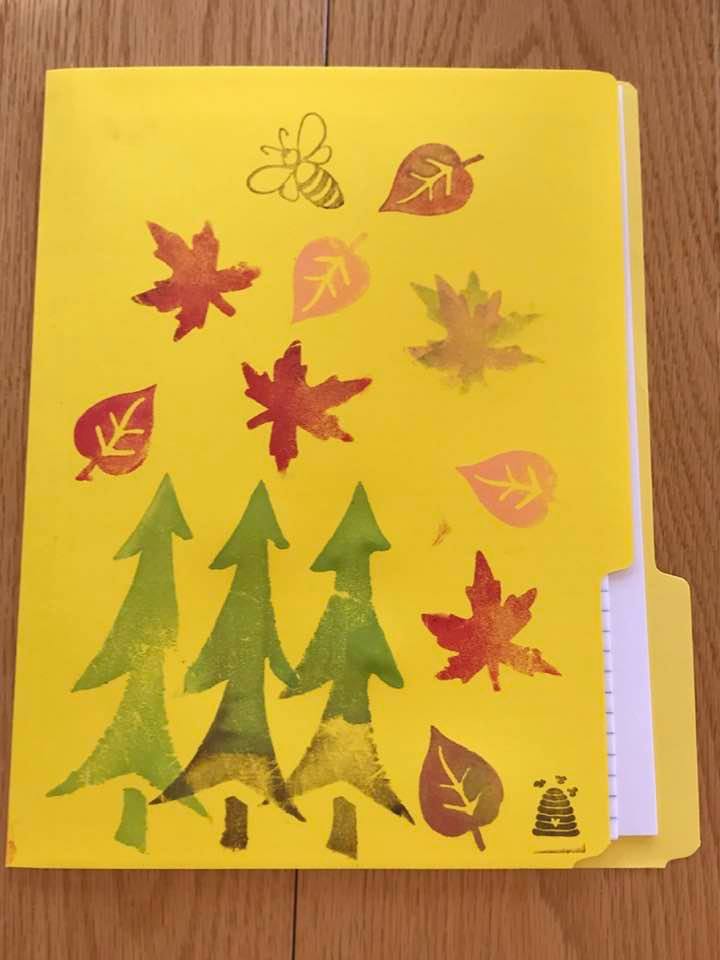 For my nature journal, I chose to recycle or repurpose a file folder. Over the years, I’ve used file folders for many projects involving the recording of nature observations. Many companies and schools get rid of file folders when they can easily be repurposed for projects such as a nature journal. I also happened to have many stamp pads at my disposal (I am a mom and a teacher), so I put those to use, as well. Yellow is my favorite color and the “fall-ish” stamps I picked to use showed up well on the bright background. It was a fun and simple project that did not cost me a cent! I thought I’d pass it on in case anyone would like to give it a try.