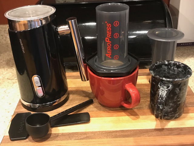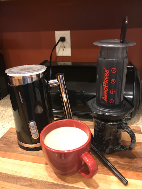 For a treat, my husband and I turned to Kind Brand Mini’s. At 90 calories each, and 4-5 total carbs depending on the flavor of the bar, they served as a sweet but not damaging snack. For a bigger snack, we got the Atkins Carmel Chocolate Nut Roll Bar. They are 180 calories and 3 net carbs per serving. I still have a latte each morning, but I make it at home with almond milk now. It’s 30 calories and 2 shots of espresso with a cup of unsweetened almond milk. I have a $40.00 Aeropress Coffee/Espresso maker and $60.00 milk frother that I had since Mother’s Day this year. The two gadgets do a great job of simulating a specialty coffee drink that is much healthier and so much less expensive. Both can be found on Amazon.