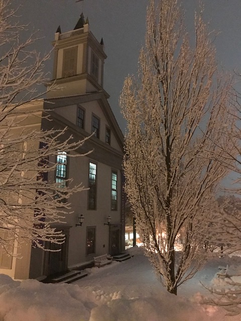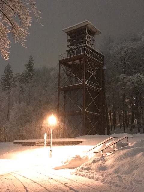 The Davis Memorial Carillon at Alfred University stands tall in the snowy darkness on campus in November of 2018.
