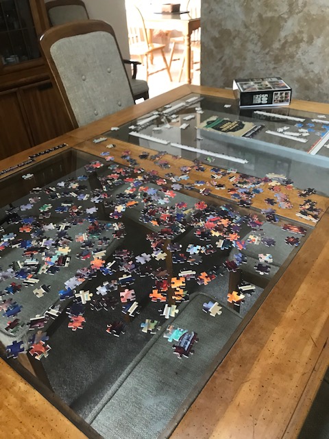 We’ve done three puzzles over the course of the ten month pandemic. The two others were 1,000 piece puzzles. My husband framed them and they are hanging in our cabin now. This puzzle will do it’s job by distracting us. Hopefully.