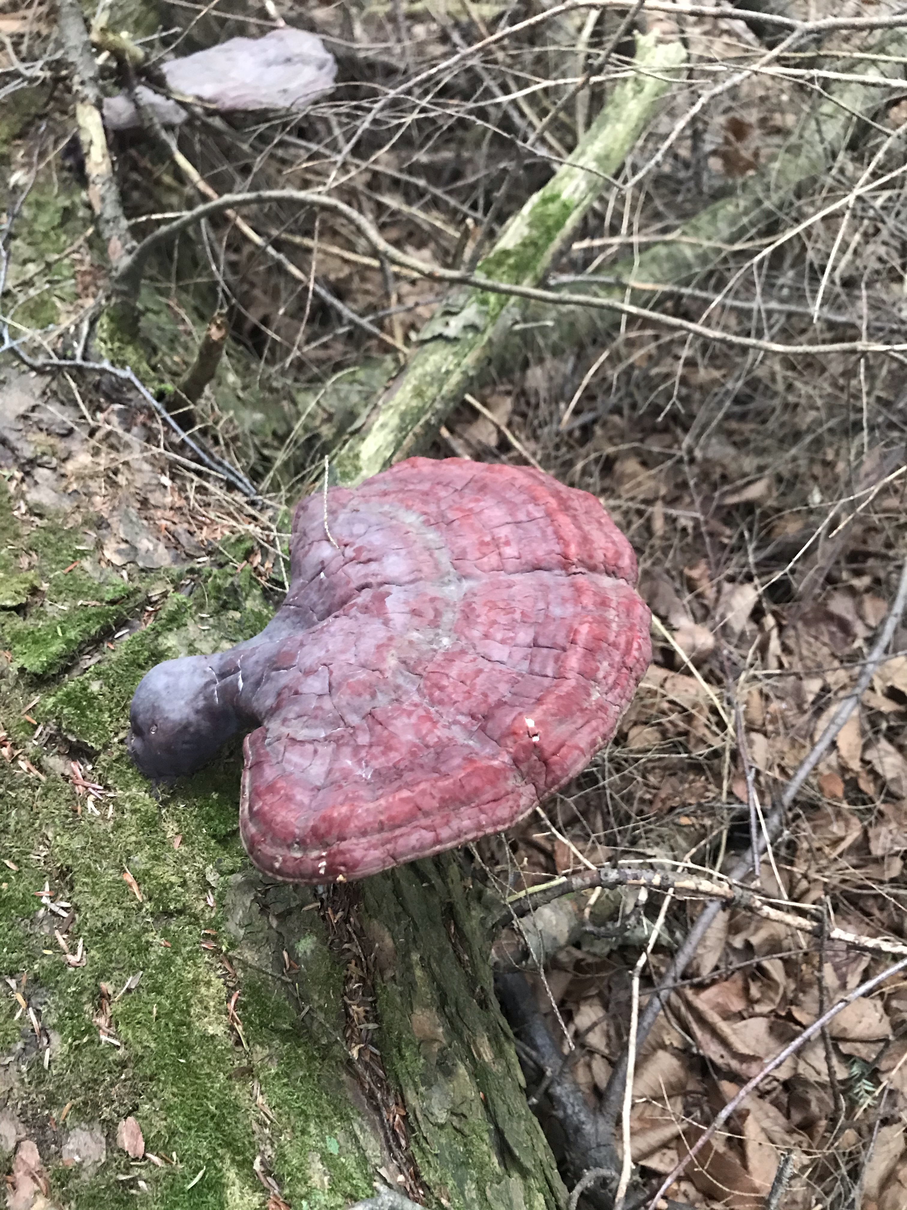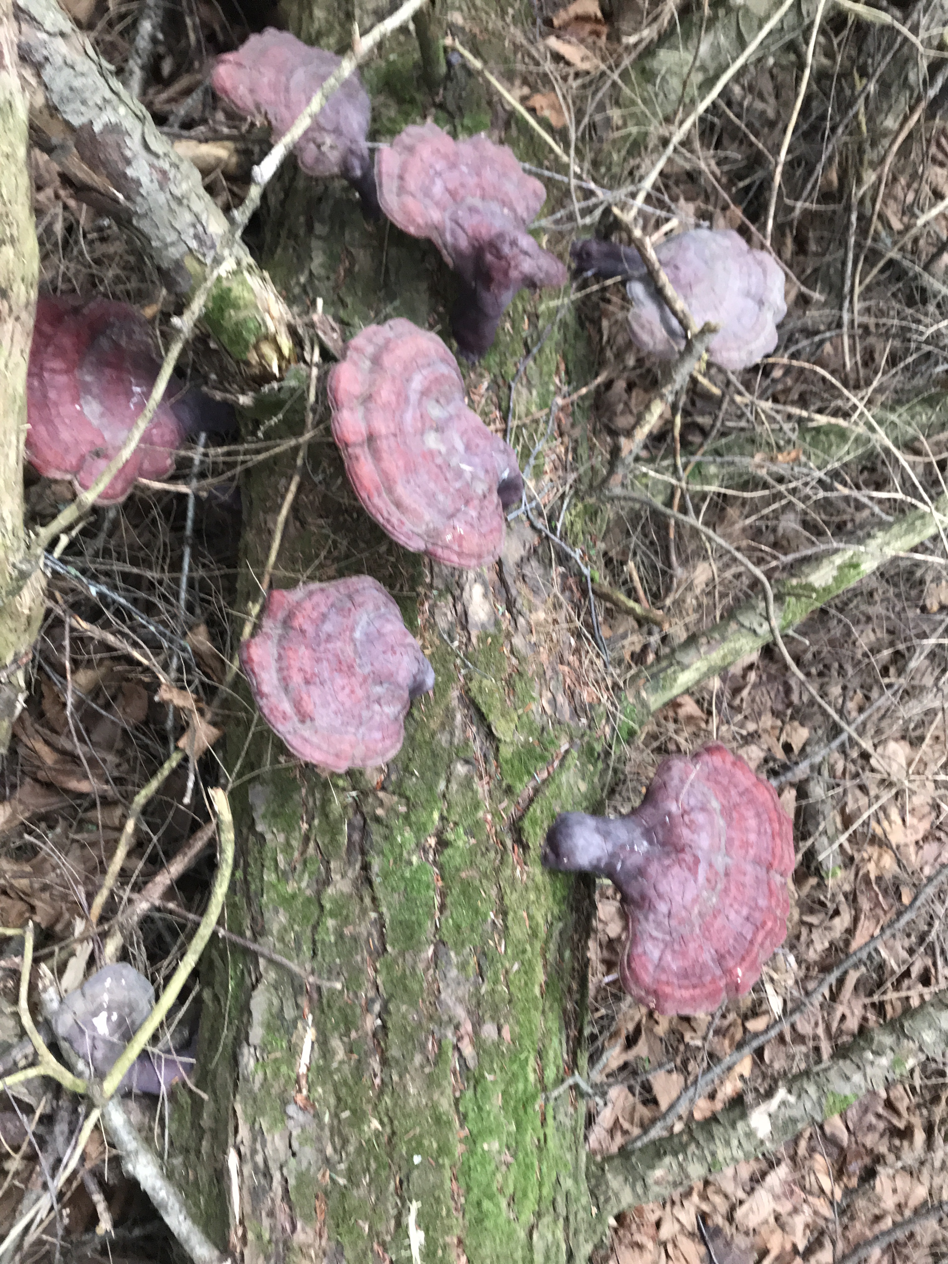 In the meantime, I found a bunch of very interesting mushrooms on a dead log in the woods where our cabin sits. It was on our property. I’ve seen shelf fungus before, numerous times in our woods and last fall saw the unique Indian Pipe in our “yard” as well. But, the fungi I saw Saturday were different…very different. At first, I thought they were some variety of turkey tail fungus. But, after arriving home Sunday night and doing some research, I realized quickly that I was wrong. The jury is still out on the fungus we saw. My foraging friend, who happened to be with me, also did some research after she got home (you can see why we are friends) and sent me what she found and thought it was – a reishi mushroom or Ganoderma tsugae. It’s a strong possibility this is what the fungi is, but I’m still not thoroughly convinced. I figured I would ask the person teaching the class on Friday.