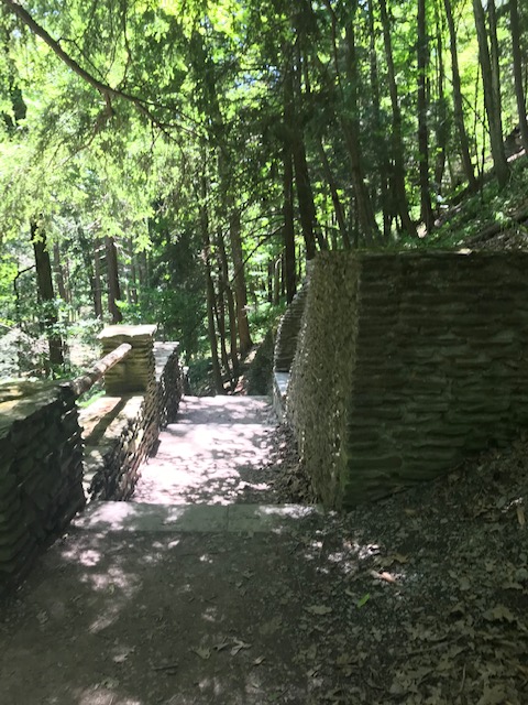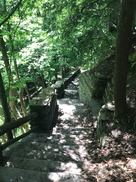 The park is noteworthy not only for the deep canyon cut by the river and the stunning waterfalls but also for the Civilian Conservation Corps work that was done there. Numerous projects were completed by the CCC in Letchworth State Park during the Great Depression Era. One of the most impressive to me was the stone walls and steps that serve to protect people from the gorge as well as transport you down to the lower levels. On our walk to visit the lower falls, we traversed 100 stone (shale) steps that got us to the landing bridge (also built by the CCC) to closer to the water level. There is an extensive list of links regarding the history at Letchworth State Park found here.