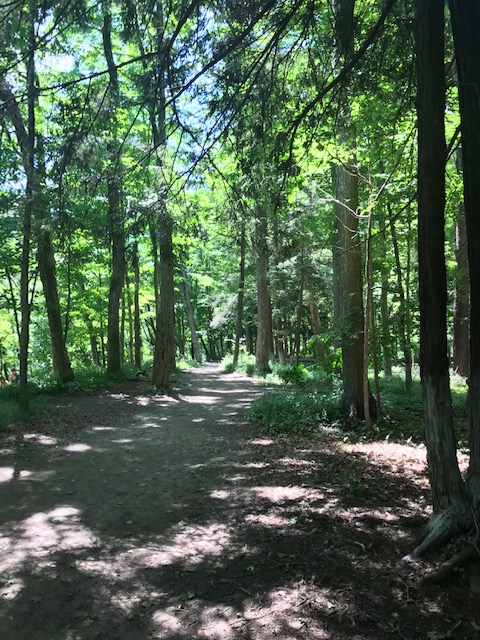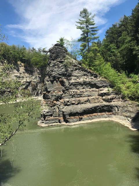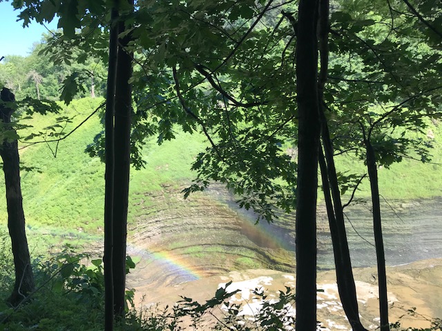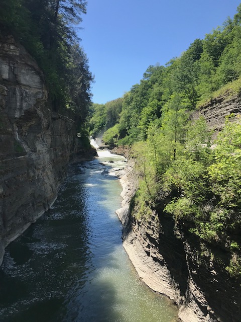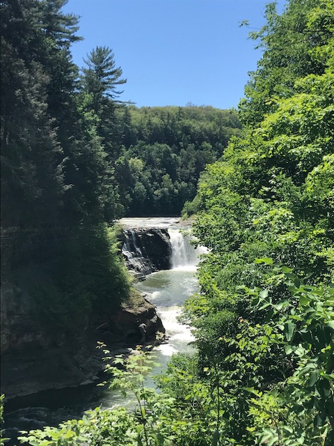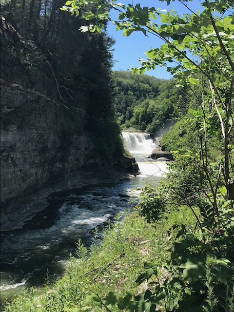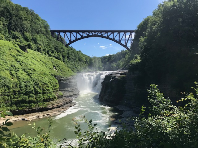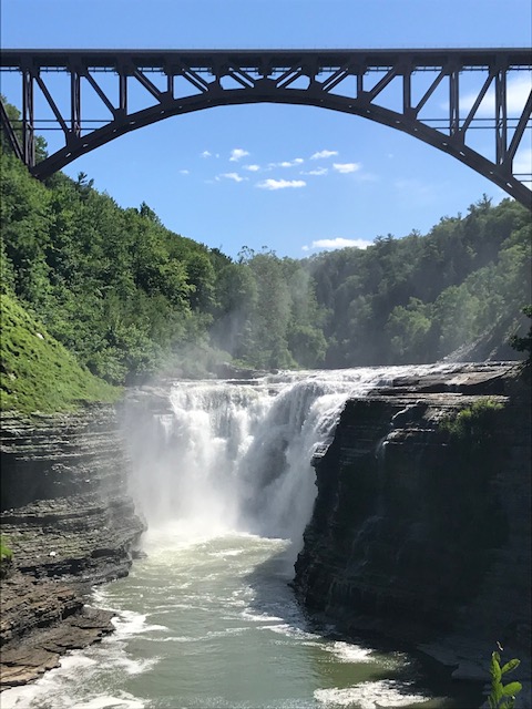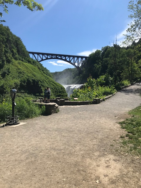 Letchworth is known as the Grand Canyon of the East and when you visit, you can certainly see why! The canyon has been cut by the Genesee River, over eons of time through shale, siltstone, and sandstone rock that line the walls and high cliffs (New York State Museum website, 2021). The current remains swift and there are three sets of waterfalls to which you can hike on well maintained trails. In the 17 miles of park, there are over 66 trails to reach different parts of the park. Yesterday, the weather was cool in the low 70’s with low humidity and a cool, soft breeze. As we approached the upper falls, a gentle mist floated through the air, refreshing us further.