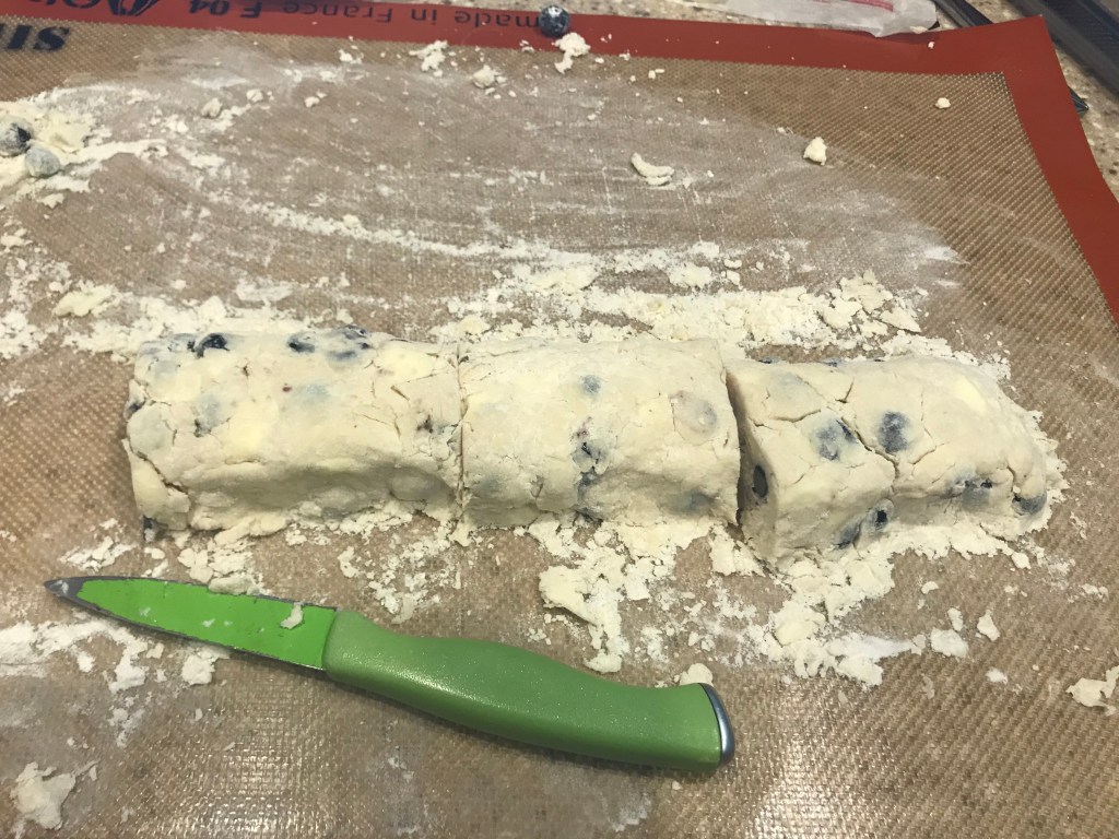 Anyway, after mixing the ingredients – by hand – and trying not to squish the blueberries, I had the most trouble forming the long rectangle 12″ x 3″ x 1.5″ from which the scones would be cut prior to baking. Squeezing and firmly shaping the dough while not crushing the blueberries was hard!
