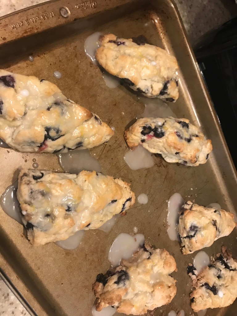 Finally, I had a shape that resembled the dimensions. I cut the scones and put them on the baking tray. Twenty minutes later – they were done! I mixed up the lemon glaze, complete with zest and was ready to coat the scones as soon as they were cool enough.