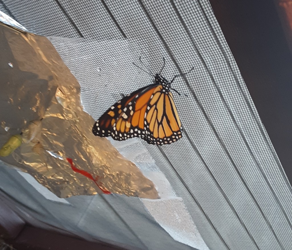 When my husband was home last week, he found that all but one of the chrysalises had eclosed a monarch. The last one came out and was getting ready to fly, as seen in the photo earlier in this post. Both my husband and I are impressed by nature. My monarch season had not ended as planned and yet all the chrysalises continued to produce healthy butterflies. They did not seem to need me. Even though six adult butterflies I raised did not get tagged, I can wish that they fly far and arrive in Central Mexico to overwinter, signaling a successful migration.
