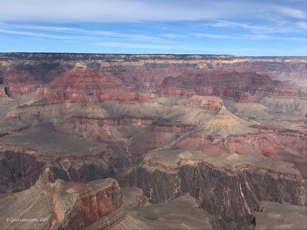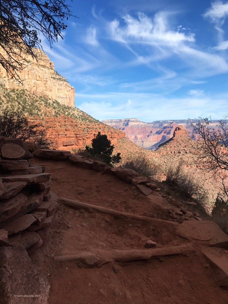 We ate dinner at the Bright Angel Lodge, next to the Kachina Lodge, next to the El Tovar Hotel. The park is still feeling the consequences of the COVID-19 pandemic. Wait times for meals are slower than what they normally would be even in a crowded park. There are fewer tables and less free access to the hotel bars and coffee shops. Our dinner was delicious and the service was wonderful. Our noontime meals were eaten on the trails, regardless of where we were. We planned and packed in the morning before heading out for the day. We carried water with us at all times.