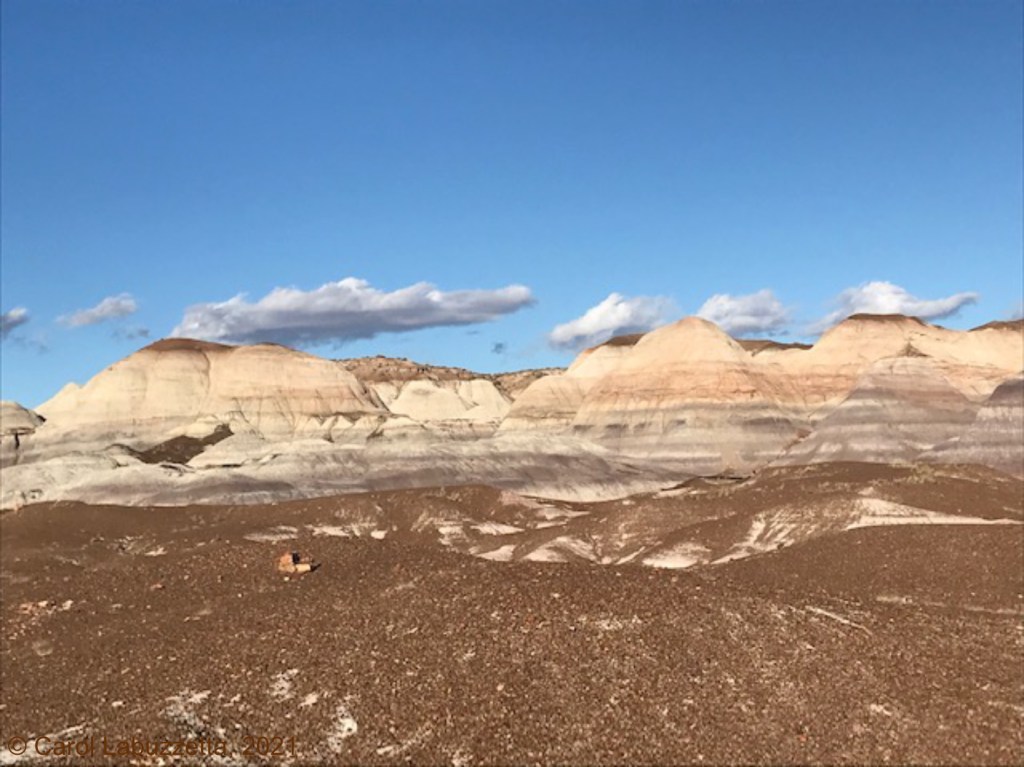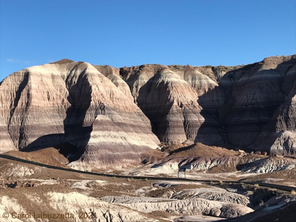 After leaving Tucson, where we also had some great Mexican food, we headed to the Petrified Forest National Park outside of Holbrook, Arizona. This park was an afterthought in my planning but was well worth it. We visited twice, once when we got into town and once the next morning, before we left town to head north towards Denver to fly home. It should not be missed – especially if you are a lover of geology and earth science! At this time of year, the park closes at 5 pm. Therefore, our first day’s visit only afforded enough time to hike the Blue Mesa Trail. The ranger told me, as I had read, that if there was only one trial you had time to hike – the Blue Mesa was the trail! I think he was right! Beautiful and unusual!