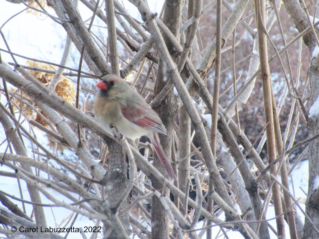 The day after that both cardinals, male and female, were sitting in the hydrangea. The female was periodially flying at the window. And, the male was sitting there watching her or flying away as if disgusted with her activity. When she sat still, she looked around, as if she were looking for him. I was able to snap soem quick photos of this pair both singally and together, all while having a good laugh that it was my in-laws trying to get inside and away from the frigid winter air.