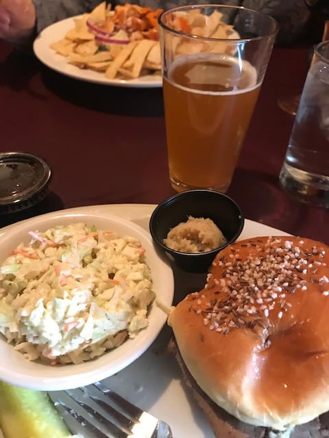 There are many places in the Buffalo area to Beef on Weck. Some serve a tastier version than others. One of the most iconic places is the Bar Bell Restaurant in East Aurora, which my husband ate at during this visit with an old high school friend. Another place in Buffalo we used to frequent for Beef on Weck was Anderson’s. The Beef on Weck is such a popular sandwich that it’s meandered up the thruway to Churchville-Chili and is served at the Rohrbach Brewing Company. This is where I had Beef on Weck during our recent trip. Yum! No fries here, just coleslaw which was spicy and delicious with a little bite. And, when in a microbrewery, you have to try one of their special concoctions. I had a light-colored beer called Another Animal. It was bitter and citrusy with notes of lemon, orange, and grapefruit. I liked it but didn’t love it, leaving about four ounces unfinished in my glass. My husband had their Highland Lager and loved it – even buying some to bring home. And, my Dad – he likes their Vanilla Stout. We’ve been to this restaurant three times in the last year and have never had a bad meal! We’ll be back.
