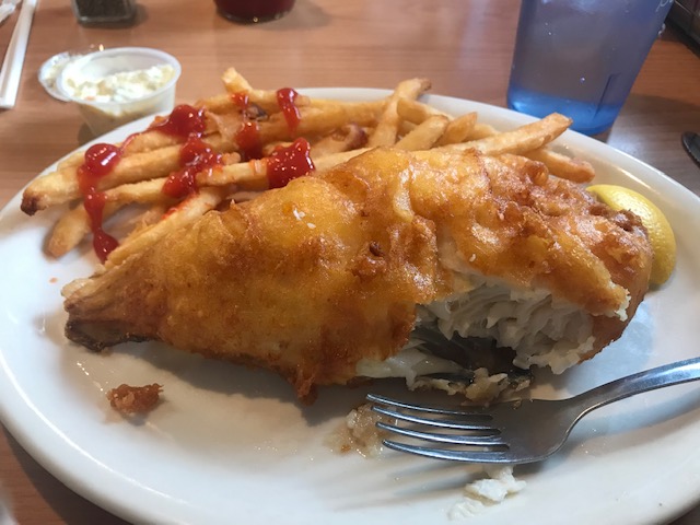 Our last meal there was the ubiquitous Friday Night Fish Fry. I wondered aloud to my husband how many states claim the Friday night fish fry as their own. I know at least two do – New York and Wisconsin. Growing up, outside of Rochester, New York, we’d go out on Friday nights for fish fries – always the same night, always the same restaurant, always the same dinner – fish fries for four! My parents have found a neighborhood restaurant that serves a good Friday Fish Fry – which is also served on Wednesdays. We ate there with my Dad several times when my mom was in the hospital last fall. Fish fries are comfort food for many, myself included. Fries and coleslaw are my favorite accompaniments. And, since we were out of town – the carb counting went out the window!