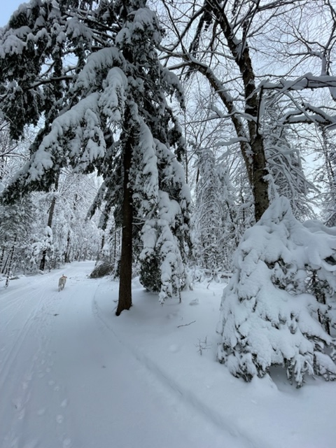 A snowy path in the woods with low-hanging boughs after the recent snow. © Carol Labuzzetta, 2022.