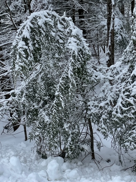 Bent over cedars are plentiful in the forest after snow. © Carol Labuzzettqa, 2023.