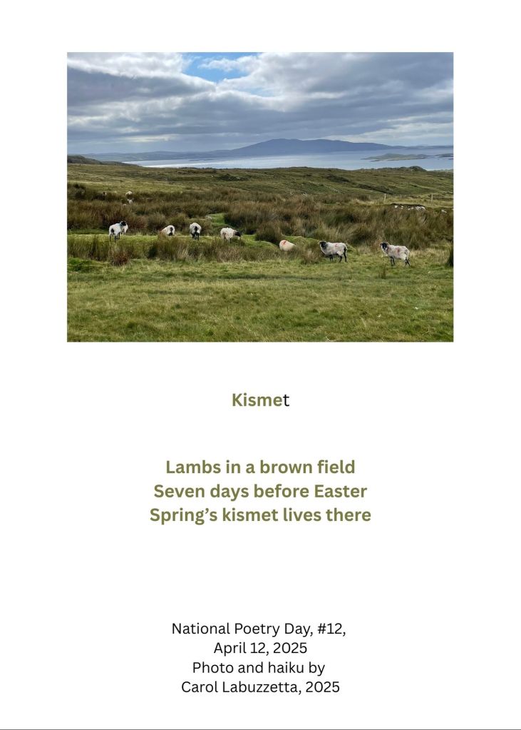 I fell in love with all the sheep we saw in Ireland last fall. Since we did a lot of hiking, we saw them almost every day grazing in the fields of Connemara, Killarney, and Wicklow National Parks. The photo I used with the haiku was from Ireland. We were there in September and did not see any newly born lambs. Plus, the landscape was green, as you’d imagine Ireland to be.