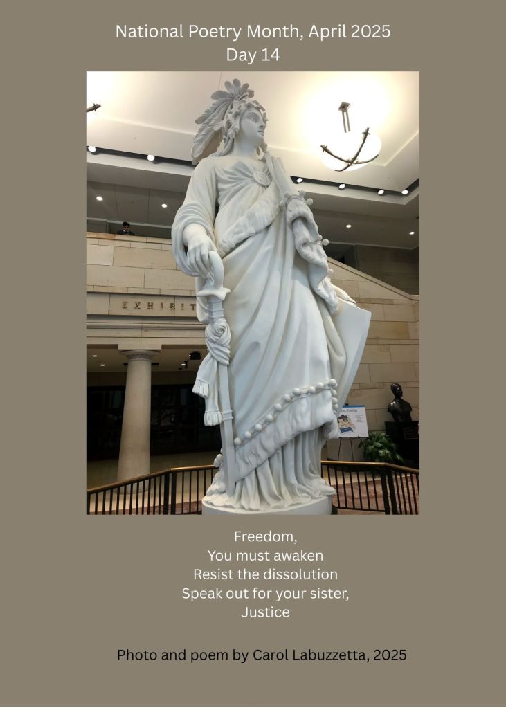 The statue, whose name is Freedom, sat outside the Congressional Auditorium in 2019. She is the same statue whose form sits atop the Capitol Building in Washington, D.C. Today, I’ve pretended that she is speaking to her sister, Justice, to resist. We need the Congressional (Legislative) and the Judicial branches of the US Government to fight for our democracy.