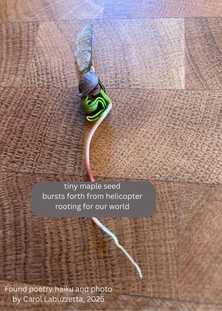 We have been enjoying some great weather this past week. With that gift has come the ability to get out in the yard. While I was cleaning up the new native garden bed by the road, I found this maple seedling pushing its way out of the seed coat. I couldn’t help but write a little poem about it.