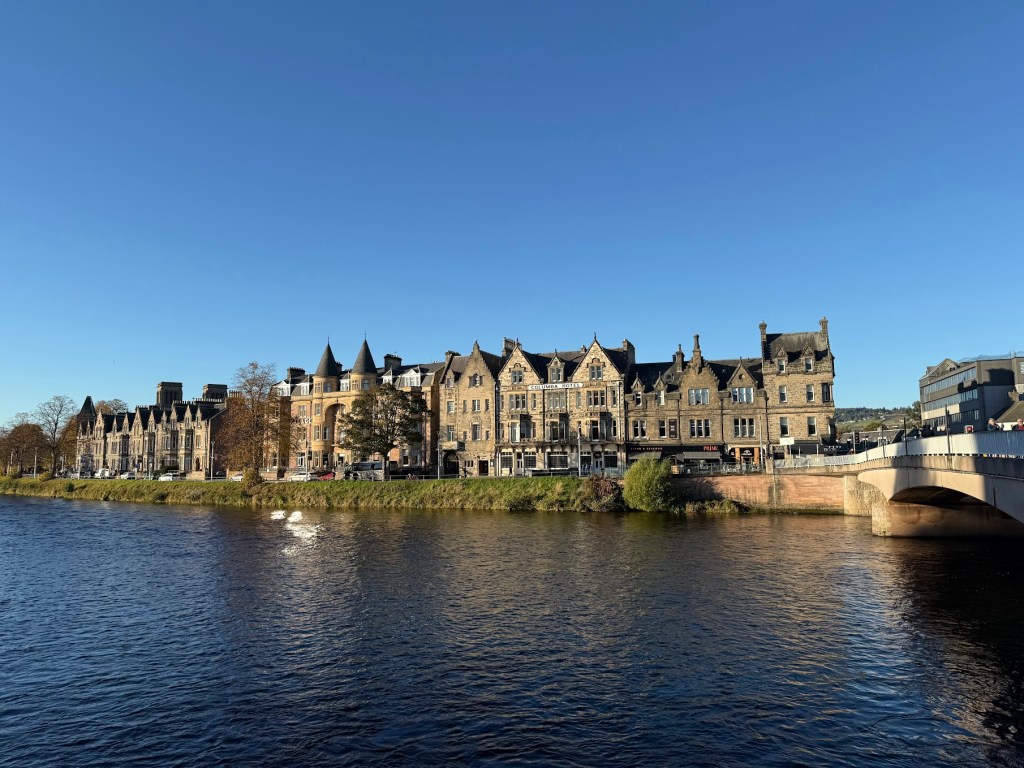 View across the River Ness after crossing the bridge. © Carol Labuzzetta, 2025.
