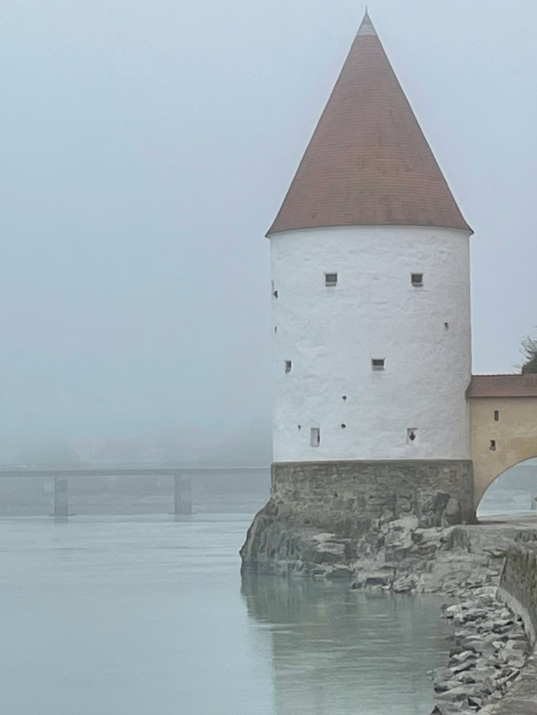 Schaiblingsturm Tower on the River Inn, Passau, Circa 1250. Once used as Salt Storage but orginally used for defense. © Carol Labuzzetta, 2023.